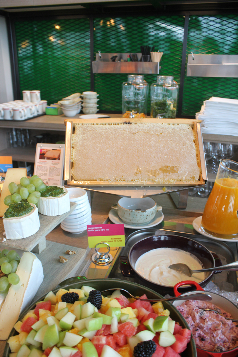 After a sound night’s sleep, it was breakfast time. The breakfast room, known as the Neni restaurant, is a magnificent giant greenhouse with beautiful dark green plants sweeping overhead and a wall of clear glass looking out over Berlin’s Zoo. Sitting there, it felt like the indoors and outdoors had somehow merged together.