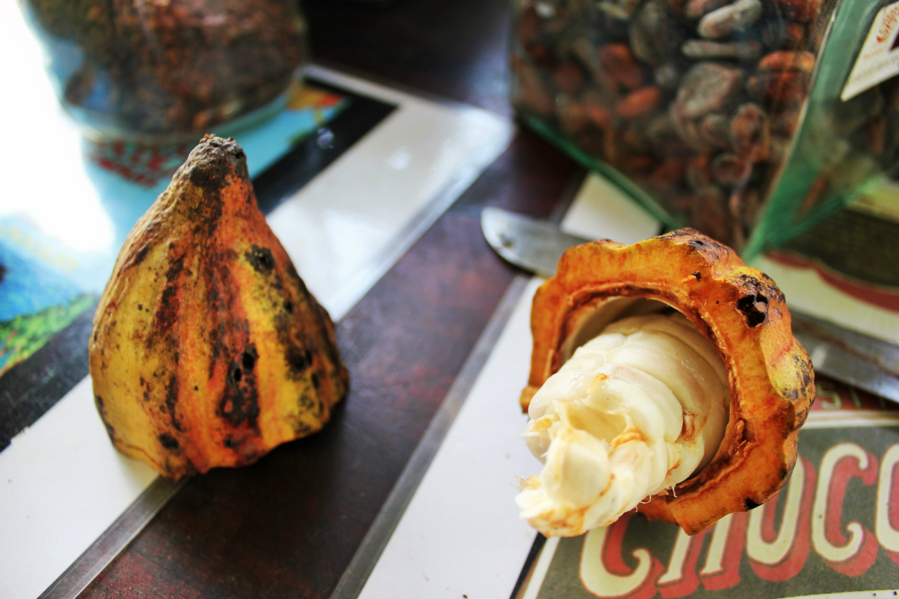 However, Villa Vanilla are still growing and harvesting their cacao pods. The fleshy, white innards of the hard shell have a sweet taste, but the flavour is nothing like the final chocolate product. The white fruit is then dried out in the sun, turning it to a dark red colour. The beans are roasted and ground to produce raw cacao nibs, which have a strong, bitter taste. From here, the nibs can be processed to make cocoa and chocolate as we know it.