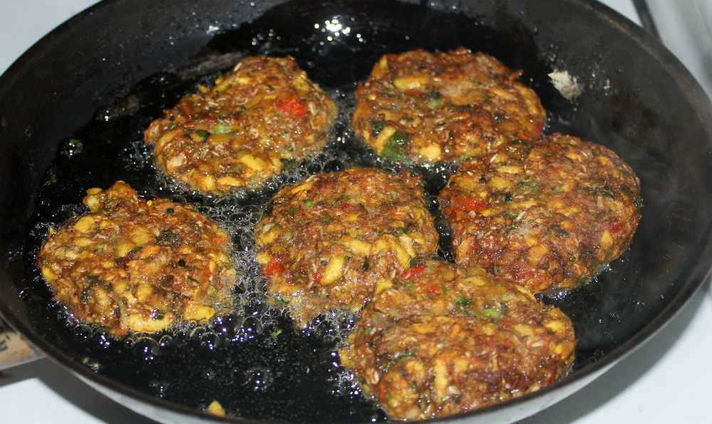 Slice the veins off the sides of the plantains, then grate the whole plantain with the skin on. While the fruit of the plantain contains protein, the skin is a good source of fibre so no need to waste it. Mix all the ingredients together, knead and squeeze firmly so that everything combines. Once mixed, form small falafel sized balls and flatten slightly. To cook, heat oil in a non-stick pan and shallow fry for a few minutes on each side.
