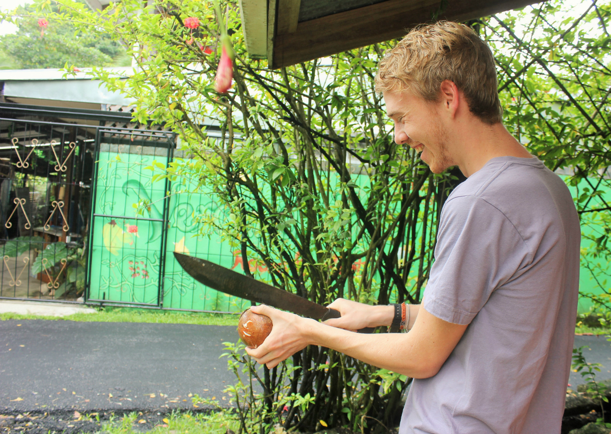 Our cooking class began with a tough coconut and a machete. We were going to make coconut milk from scratch. This first involves hacking the skin off of some brown coconuts, which is no easy task. Fortunately, Veronica herself is so good at it that, as her husband says, she can take the skin off coconuts without even looking. After that, the coconut is grated and mixed with some water, then the coconut milk is squeezed out and ready to cook with. This was hard work to say the least but very satisfying.