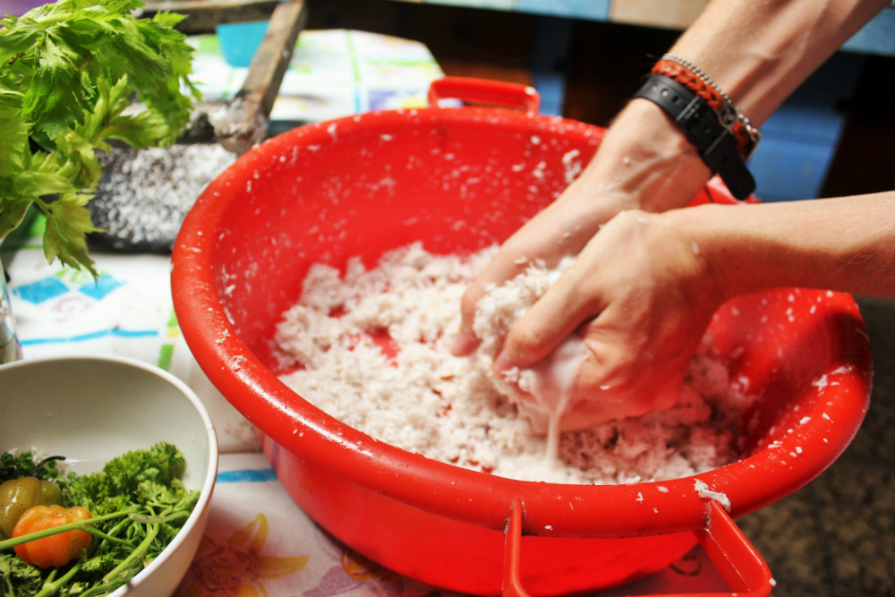 Of course, there is one signature dish to be made with coconut milk here on Costa Rica’s Caribbean coast: coconut rice and beans. Cooking coconut rice and beans is a slow process. Pre-cooked red beans are mixed in with the coconut milk, which is then simmered for 15 minutes. After this the white rice is added and the pot is left to boil for 20 minutes or so. The process is sticky and can cause the pan to burn, so you have to be careful. During Veronica’s cooking class we also learned how to make green plantain and oat patties (recipe to follow!), a thick vegan gravy from leftover scraps and ends of veggies, and star fruit and ginger juice with fruit straight out of her garden.